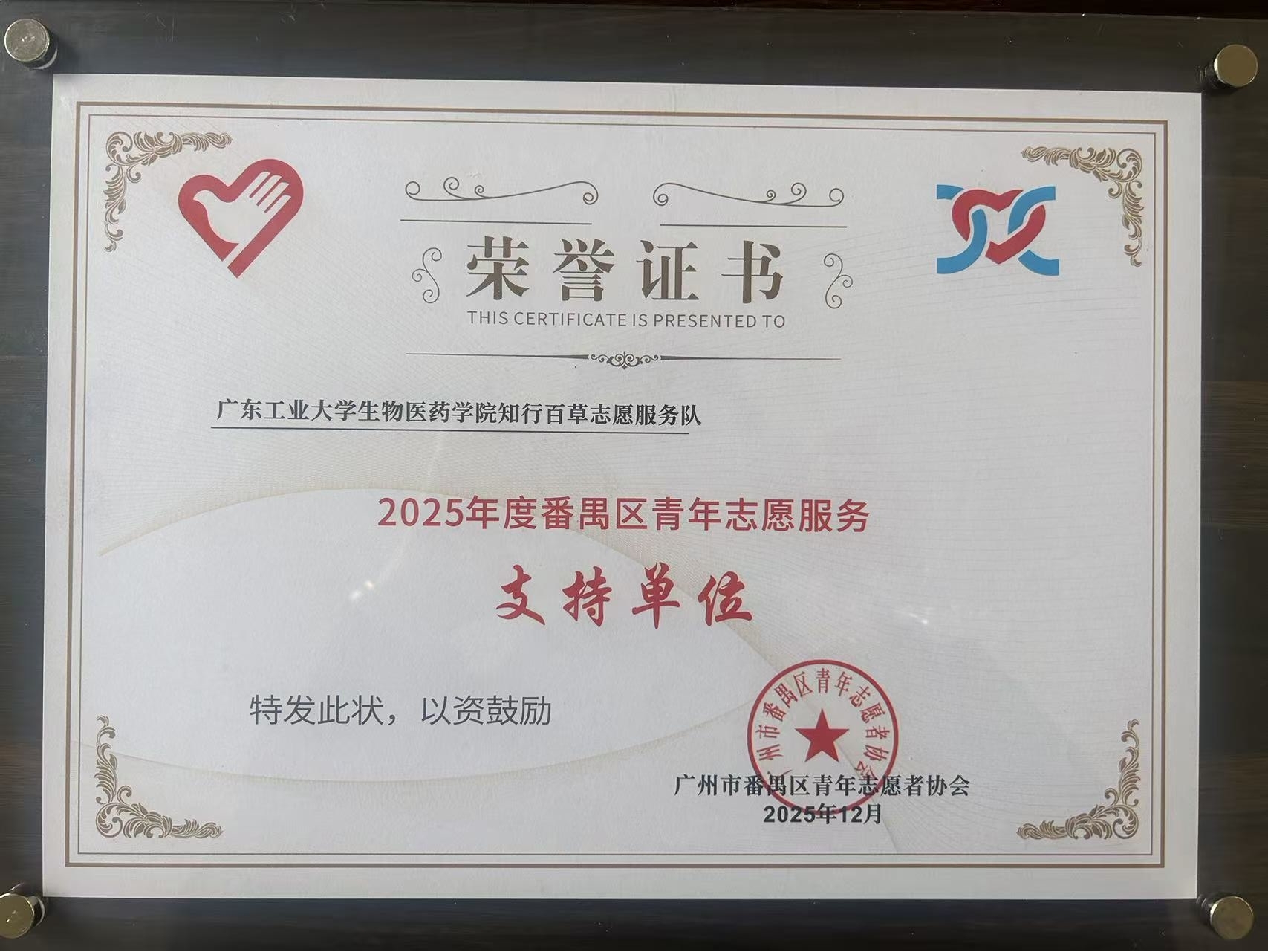 在表彰环节,我院“知行百草”志愿服务队荣获“2025年度番禺区青年志愿服务支持单位”,此次获奖不仅是一次荣誉的收获,更是一次生动的实践展示。我院将继续深化志愿服务与专业教育、文化传承的融合,培育更多怀揣社会责任感、具备过硬本领的新时代青年,为助力广州“志愿之城”建设持续贡献青春力量。