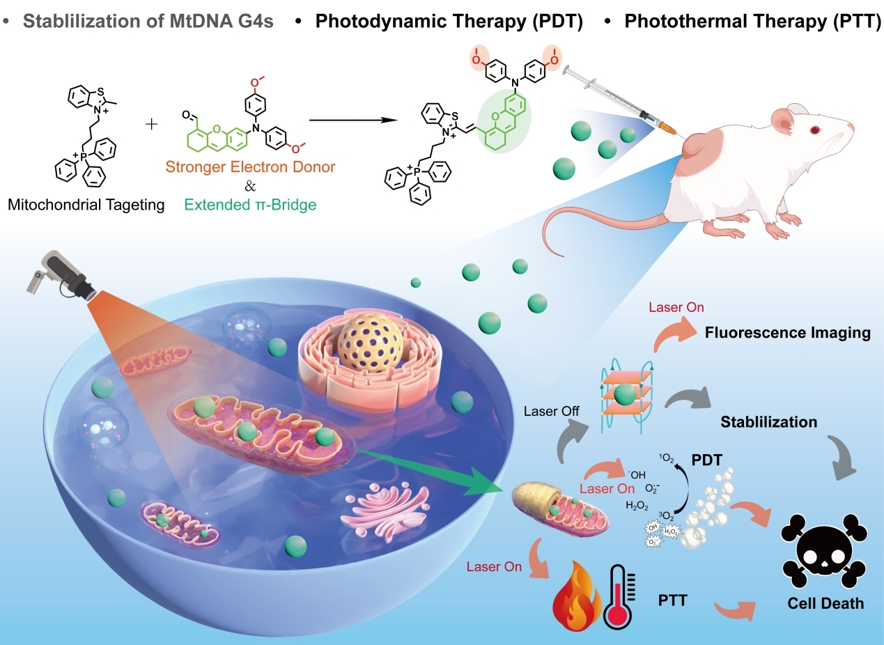 传统的单模式光治疗存在穿透深度有限、难以根除微转移灶等问题。本研究提出的分子设计策略,在线粒体靶向单元(三苯基膦)和苯并噻唑骨架基础上,通过引入甲氧基取代和扩展π桥,优化了分子的光物理性质,使其吸收/发射波长红移至近红外区(685 nm),实现了深组织穿透与实时肿瘤定位。该光敏剂SPNO能特异性识别并稳定线粒体DNA G-四链体,在无光照条件下即可通过诱导细胞周期G0/G1期阻滞抑制肿瘤增殖与转移;在近红外激光照射下,可高效产生I型与II型活性氧并具备优异的光热转换性能,协同光动力与光热治疗。在乳腺癌小鼠模型中,SPNO介导的诊疗一体化方案显著抑制了肿瘤生长,且未表现出全身毒性,展现出了良好的生物安全性。该成果不仅为克服单模式治疗的局限性提供了新策略,而且为基于G-四链体的精准癌症诊疗药物设计提供了全新范式。本研究从分子识别到功能输出的完整证据链,阐明了SPNO通过靶向线粒体能量代谢基因和凋亡通路发挥抗肿瘤作用的分子机制,深化了对G-四链体靶向光疗协同作用的理解,有望推动相关领域的发展。